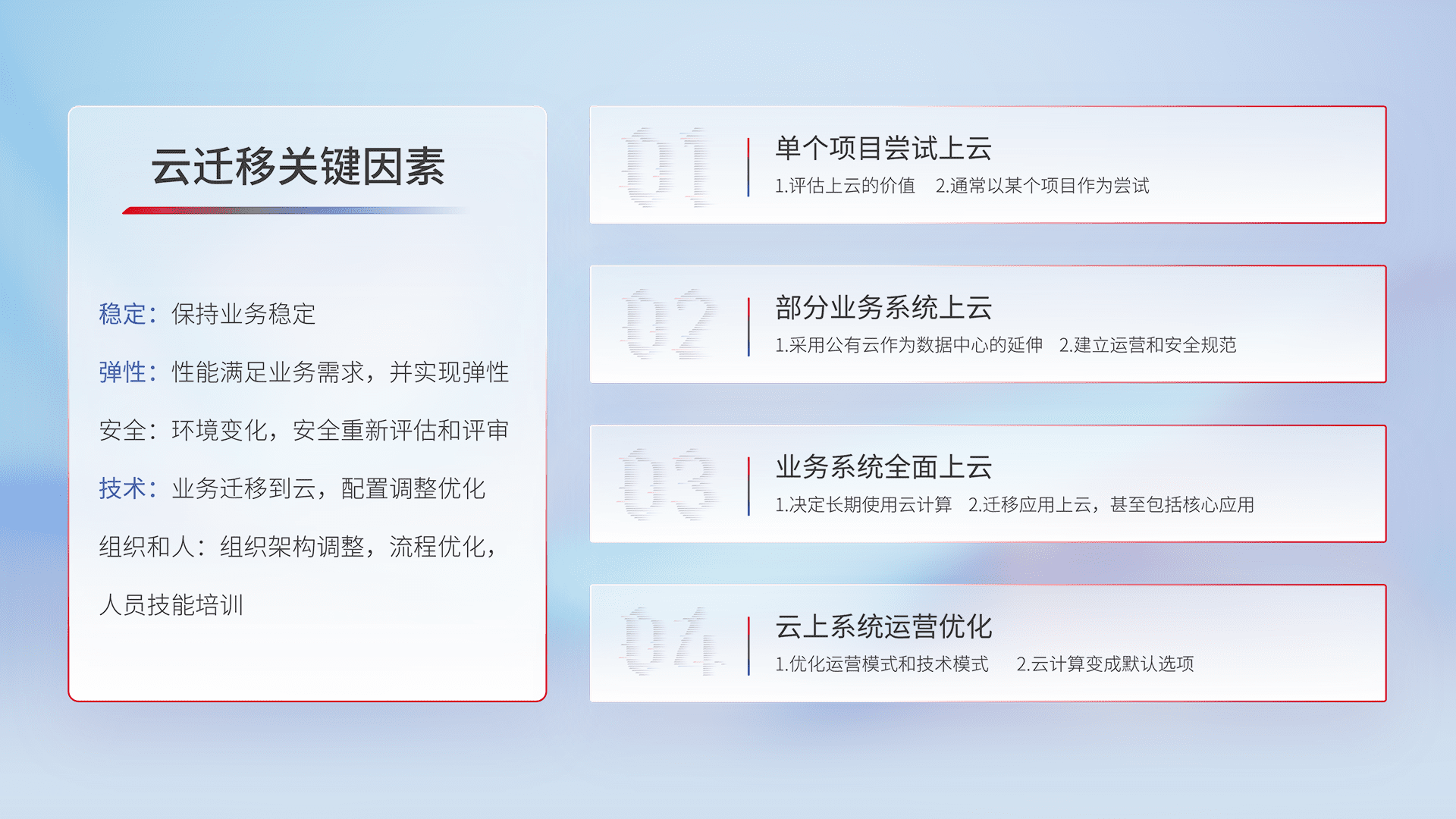 结合实际业务,,,,从规划设计、、、云平台选型、、云原生改造、、、、数据迁移、、、、集成交付,,,迁移全过程为客户识别最佳上云路径,,,,做好风险识别管理,,,设计网络架构、、、、身份权限、、、安全审计合规、、操作审计、、、、日志审计、、、监控告警策略、、、、多站点容灾设计等,,,,对云上基础设施进行整体规划,,,,提升IT治理水平,,,以满足弹性、、、、高可用、、、高性能的需求。。。。