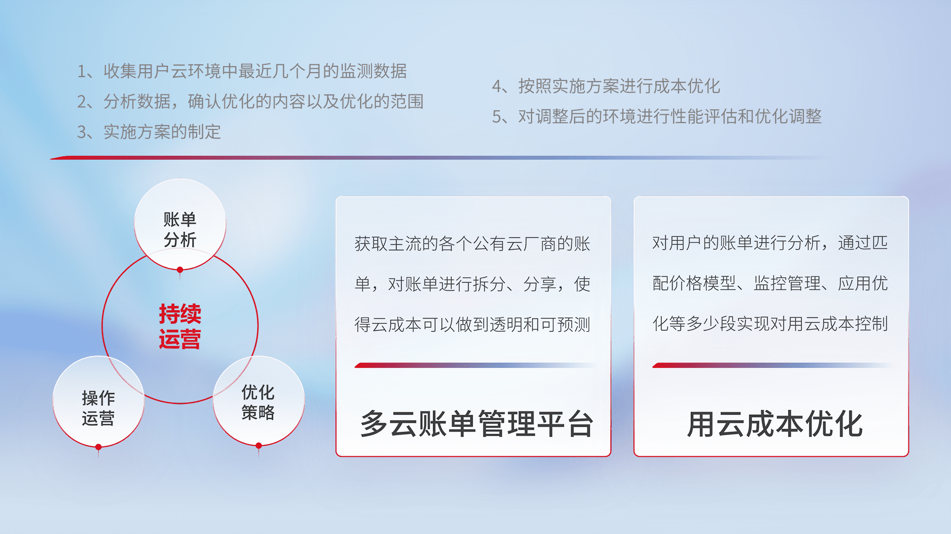 通过多云纳管,,,以统一的资源数据模型把客户的云资源进行抽象和封装,,,,进而实现对多云资源的统一操作,,,,保障云资源管理的可靠性、、稳定性与可用性。。量身定制化运维内容,,配置、、开发运维、、、补丁管理、、、、备份、、、、监控、、、、认证和访问管理、、、审计和日常巡检等,,保障在用云过程中的可靠度,,,稳定度以及高可用率。。